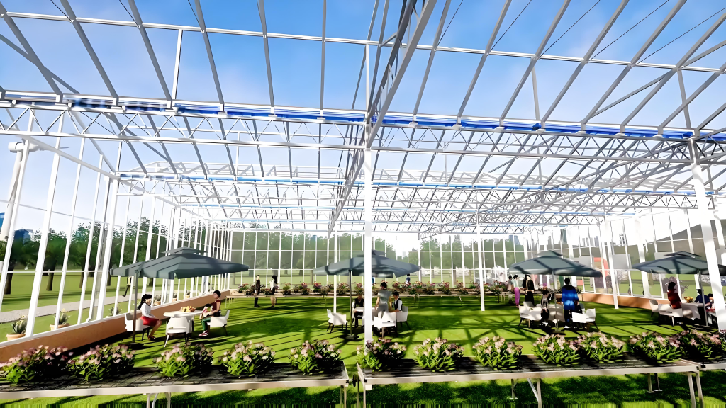 The building adopts a high-transparency double-glazed curtain wall and lightweight galvanized steel structure, equipped with an intelligent shading system, natural ventilation, and automatic temperature & humidity control.